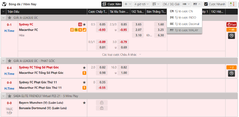Tỷ lệ odd Malay được thể hiện chi tiết